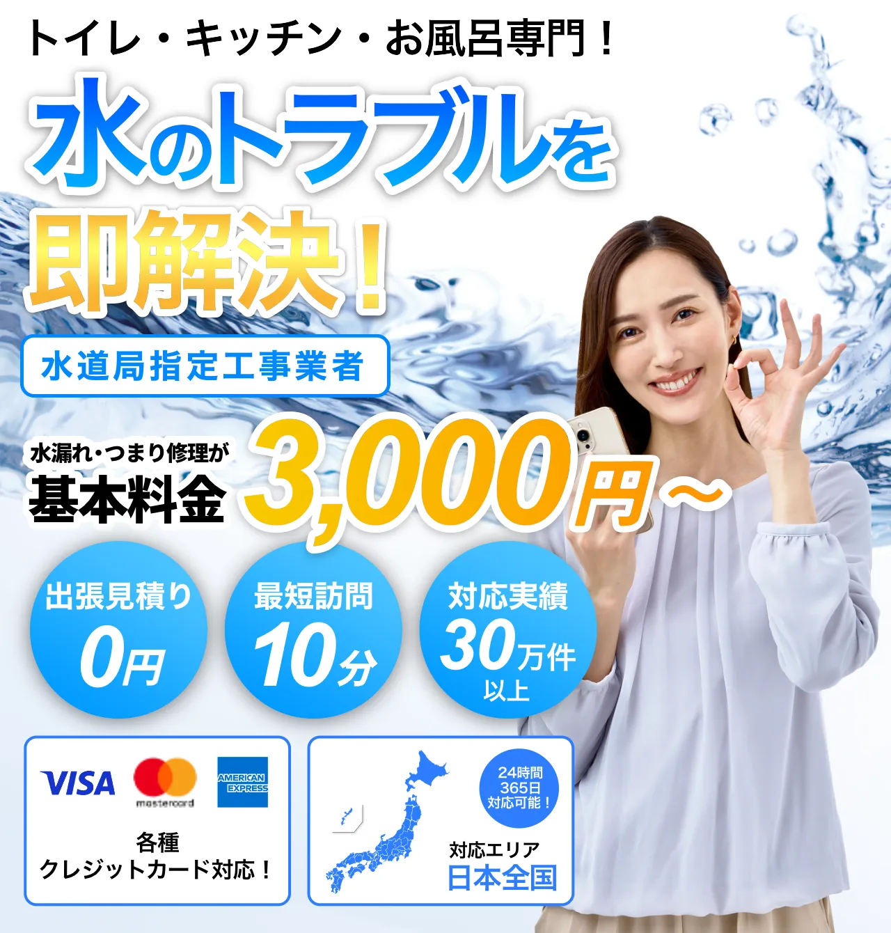 24時間365日対応します。ご相談のみも歓迎ですので、蛇口からの水漏れ、トイレや排水のつまりなど、水まわりのトラブルが発生しましたらまずはお電話ください。お気軽にご連絡ください。